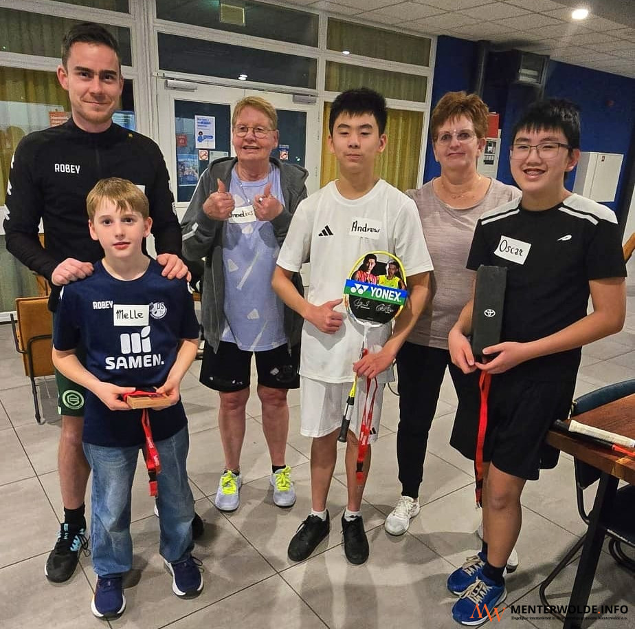12 jeugdspelers en 12 senioren van badmintonvereniging Dropshot '74 uit Muntendam speelden gisteravond het jeugd-seniortoernooi. Dat gebeurde in dorpshuis De Menterne. Een team bestond uit een junior en senior. Er werden 3 partijen van 7 minuten gespeeld. Andrew You kwam, met 53 punten, als beste uit de bus. Hij ging met een nieuwe badmintonracket van Valkema Sport in Veendam naar huis.