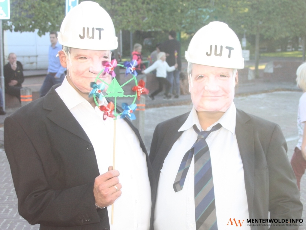 Actiegroep Storm Meeden had op het dorpshuisplein een 'kanon' geplaatst, die tijdens de bijeenkomst in de sporthal regelmatig het lawaai van draaiende windmolens produceerde. Tientallen bezoekers droegen een papieren masker van Moorlag.