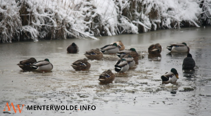Beter een goede buur dan een verre vriend. Dat komt met dit winterweer goed van pas. Samen het voetpad schoonvegen. Een mooi moment om de laatste nieuwtjes uit te wisselen. Zoals hier op de foto in Meeden (Badweg). Zijn de dieren verrast door het koude gure weer? De eenden (onder) zitten op het flinterdunne laagje ijs in het Oude Verlaat in Muntendam.