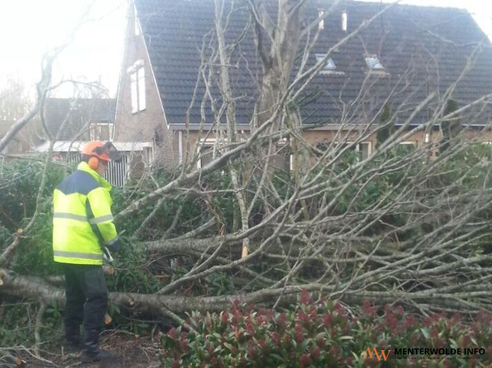 Het onstuimige weer zorgt in de regio voor problemen. Zo ook in Meeden, waar vanmorgen een meters hoge (dode) boom aan de Elzenlaan is omgewaaid. Gelukkig viel de boom op het voetpad en in de voortuin van een rijtjeswoning. De boom was op een personenauto terechtgekomen als die naar de andere kant was gevallen. De boom maakte deel uit van een rij van 3 bomen.