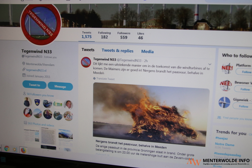 "Dit lijkt me een uitstekende manier om in de toekomst van die windturbines af te komen. De Maimers zijn er goed in! Nergens brandt het paasvuur, behalve in Meeden." Dit curieuze bericht twitterde actiegroep Tegenwind N33 vanmorgen, naar aanleiding van het paasvuur dat gisteravond aan de Zevenwoldsterweg in Meeden door liefst 1.750 toeschouwers werd bekeken.