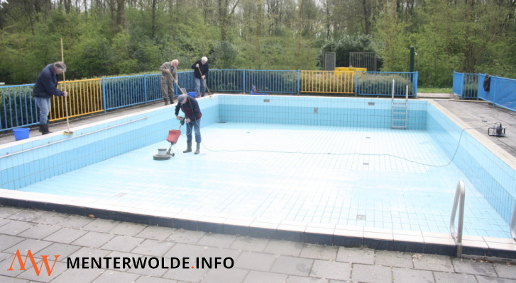 Openluchtzwembad De Kolck in Meeden opent maandag 28 april zijn deuren voor het nieuwe seizoen. Een groep vrijwilligers is drukdoende het bad zwemklaar te maken. Het bad is leeg. De bodem en wanden van de 3 baden worden schoongepoetst. Uit het diepe bad is circa 900 kuub water gepompt. Dit bad wordt morgen weer gevuld. Dat duurt 2 dagen.