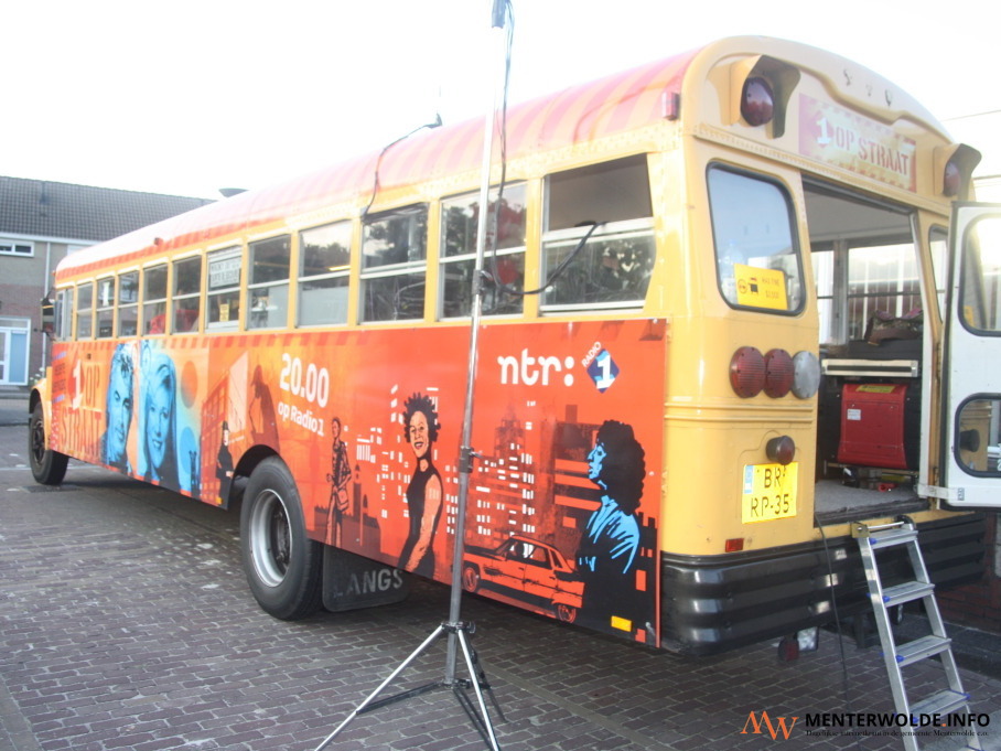 Presentator Marianne van den Akker verzorgde vanavond, tussen 8 uur en half 9, de rechtstreekse uitzending van 1 op Straat vanuit haar omgebouwde Amerikaanse schoolbus vanaf het dorpshuisplein in Meeden.