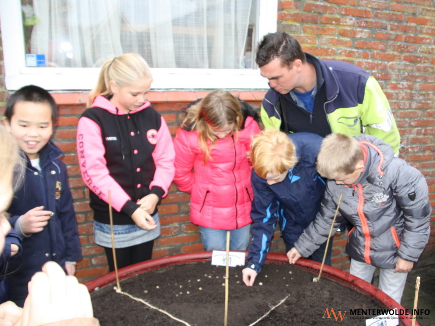 Op het schoolplein van obs De Mieden in Meeden staan sinds vanochtend 2 bloembakken. De leerlingen van alle groepen pootten vanmorgen ruim 150 bloembollen in 1 van de bakken. Medio april, mei volgend jaar moet het resultaat zichtbaar zijn. Tot die tijd moeten de kinderen hun eigen deel van het tuintje onderhouden. Hiermee gaat een wens van de ouderraad van de school in vervulling.