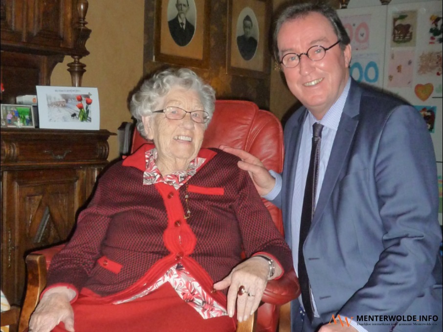 Roelie Groenendal-Koning kreeg op haar verjaardag ook bezoek van burgemeester Jan Lonink van Terneuzen. Ze spraken drie kwartier met elkaar. "Ze vertelde onder meer over Meeden en dat ze daar een prachtige tijd heeft gehad. De burgemeester kon zich niet voorstellen dat ze al honderd jaar was."