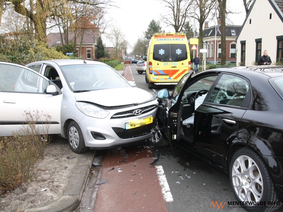 Twee personenauto's zijn vanmiddag omstreeks kwart over één frontaal op elkaar gebotst op de Hereweg in Meeden. Een 43-jarige Muntendammer haalde een geparkeerde wagen in, maar zag daarbij een tegemoetkomende auto over het hoofd. Daarin zat een bejaard stel (personalia onbekend). Deze twee inzittenden zijn uit voorzorg, per ambulance, naar het ziekenhuis gebracht.