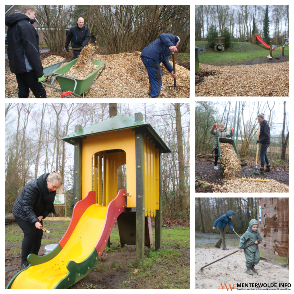 Speelbos Meeden wordt vanmiddag weer klaargemaakt (NLdoet) voor het nieuwe seizoen. De paden worden voorzien van nieuwe snippers en de speeltoestellen krijgen een schoonmaakbeurt. De opkomst om mee te helpen is minder groot dan voorgaande keren. Het weer (regen) zal daarvan de oorzaak zijn. De helpers - kinderen en volwassenen - trekken zich niets aan van de regen.