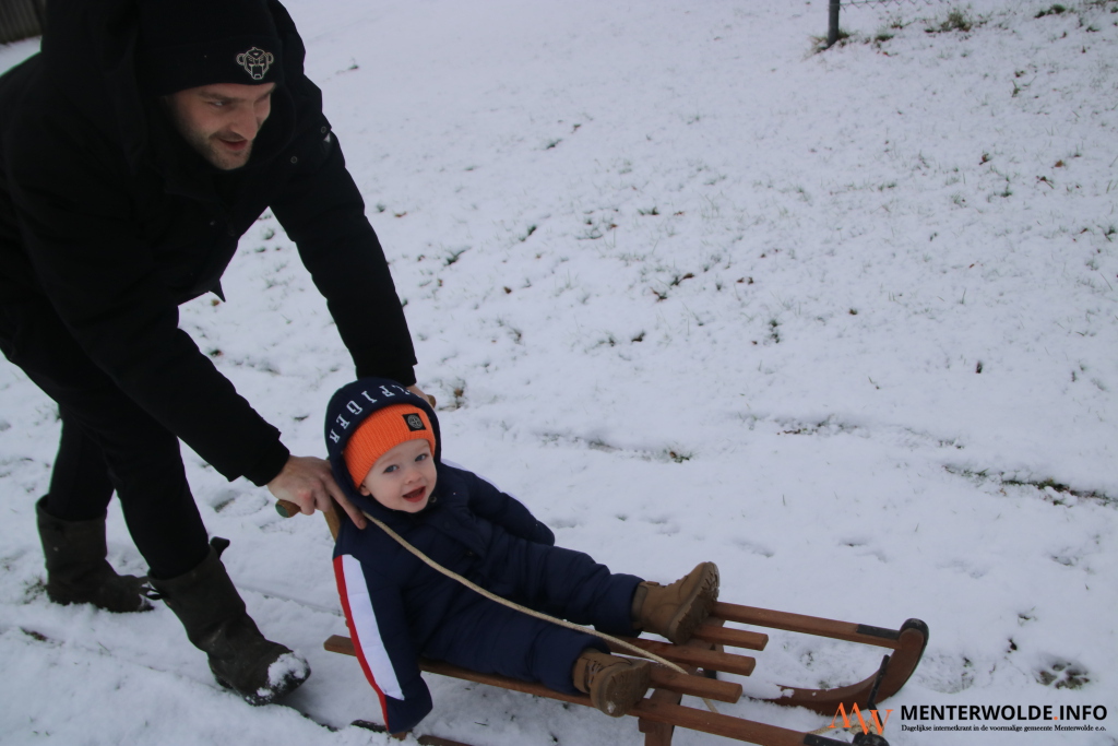 Maarten Jasper duwt zijn zoon Noël door de sneeuw in Muntendam (boven).