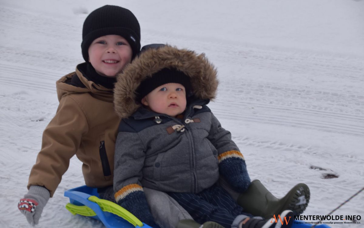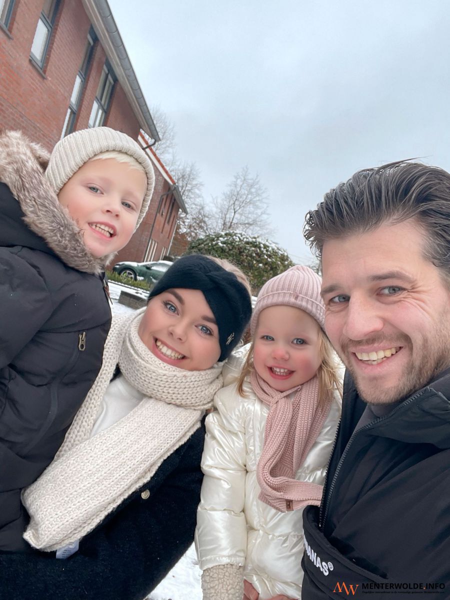 Maureen en Wouter Mein uit Veendam genieten met hun kinderen van het winterse weer (onder weede rij).