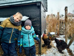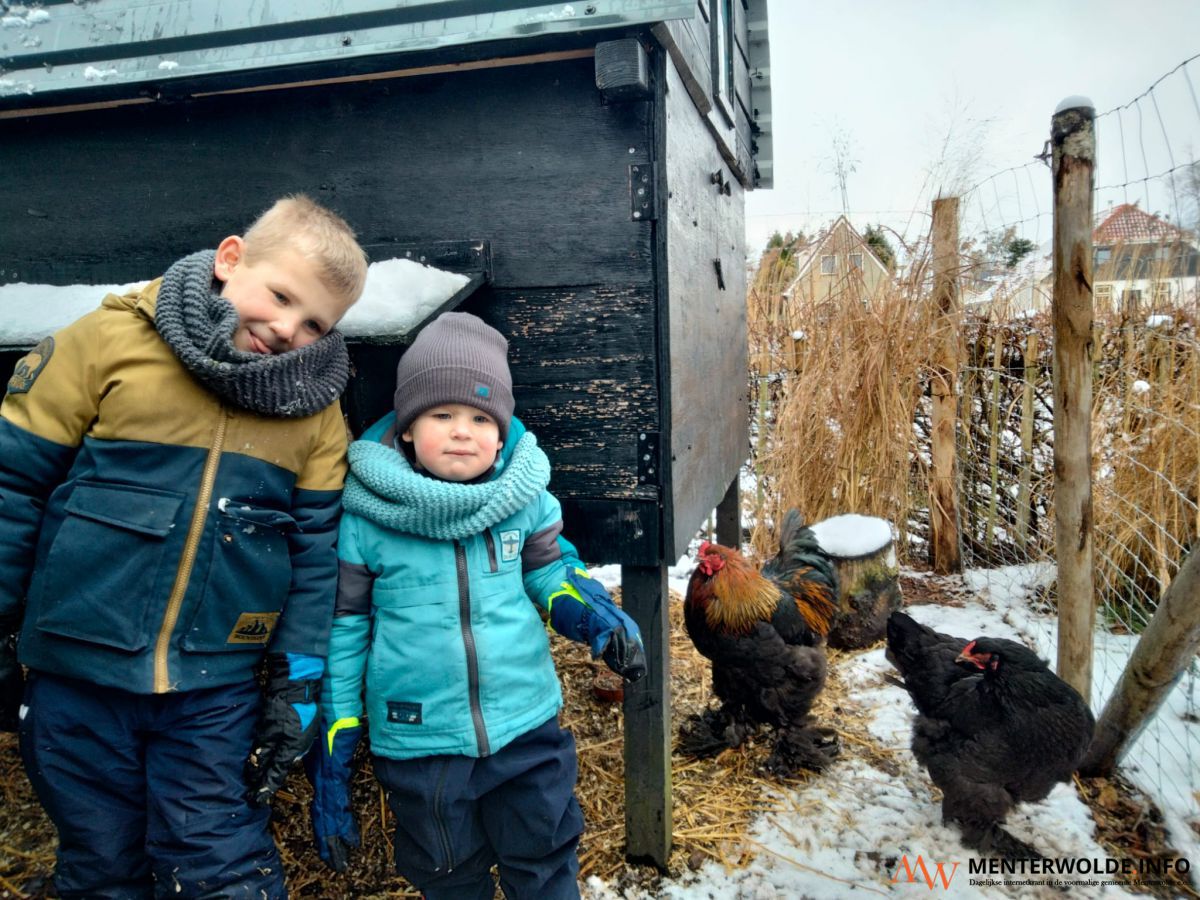 Teun en Jens ten Hove uit Zuidbroek staan bij de winterse kippenren (onder bovenste rij).