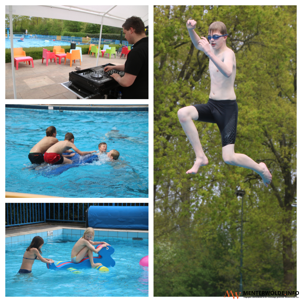 Enkele tientallen kinderen waren vanmiddag in openluchtzwembad De Kolck in Meeden. D.j. Nico verzorgde de muziek tijdens de kinderdisco. Die was georganiseerd door Dorpsraadcoöperatie Meeden in het kader van Bevrijdingsdag. Af en toe gingen de handen van de zwemliefhebbers in de lucht. Het plezier in het water was er, mede door de muziek en het prachtige weer, volop.