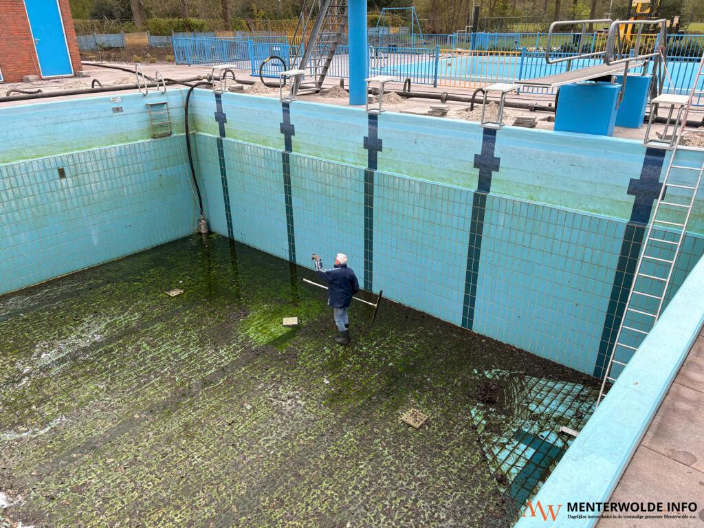 Het openluchtzwembad De Kolck in Meeden wordt klaar gemaakt voor het nieuwe seizoen. Stichting Zwembad De Kolck (voorheen Dorpsraadcoöperatie Meeden) doet dat voor het dertiende seizoen. "Het water is eruit, alle kikkers zijn weg. Met de hogedrukspuit wordt het bad schoongemaakt", zegt Niels Holthof namens de stichting. Als alles meezit, wordt het grote bad vanavond weer gevuld met 800 kuub water.