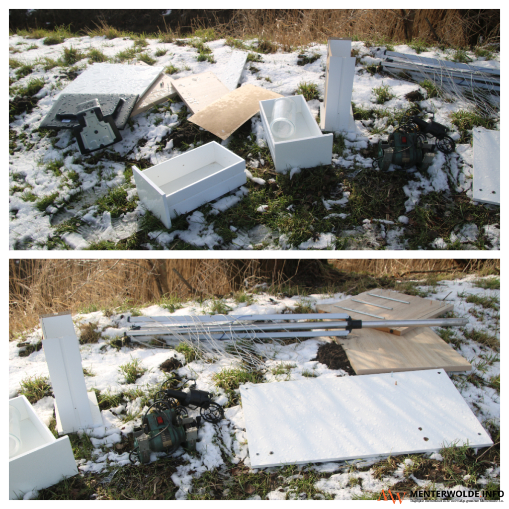 Een droogrek, kast(lades) en gereedschap zijn gedumpt langs de Daaleweg, dier Tripscompagnie verbindt met Muntendam (Tussenklappen-Westzijde). Het is niet bekend wanneer dit is gebeurd, maar het werd vanmorgen ontdekt. Wie draait hiervoor (weer) op? Medewerkers van de gemeente Midden-Groningen zullen dit weer weghalen. Dus draait de gemeenschap (inwoners) hiervoor op.
