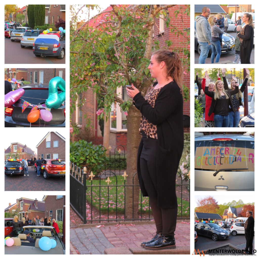 Amber Braam uit Muntendam viert vandaag haar 24e verjaardag. Normaal gesproken zit het huis vol visite. Maar vanwege het coronavirus kan dat nu niet. Ze zat vanavond kort na 8 uur met haar vriend Tom Geurtz in de kamer toen ze buiten 'een partij herrie' hoorde. Afkomstig van familie en vrienden. Die reden in hun auto's van de BV-straat in colonne naar de Kerkstraat waar Amber en Tom wonen.