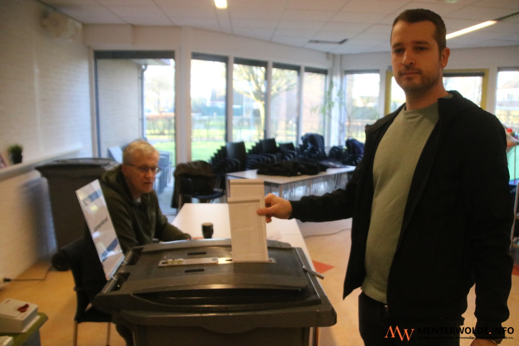 Jeroen Jasper (33) uit Muntendam is vanochtend om stipt half 8 de eerste die voor de gemeenteraadsverkiezingen Midden-Groningen stemt bij De Zijlen, locatie De Gilde, in zijn woonplaats. "Ik maak gebruik van mijn stemrecht. Dat kan niet overal in de wereld. Ik stem altijd", vertelt Jasper. Hij was eind 2024 een van de 43 deelnemers aan de cursus Politiek Actief in Midden-Groningen.