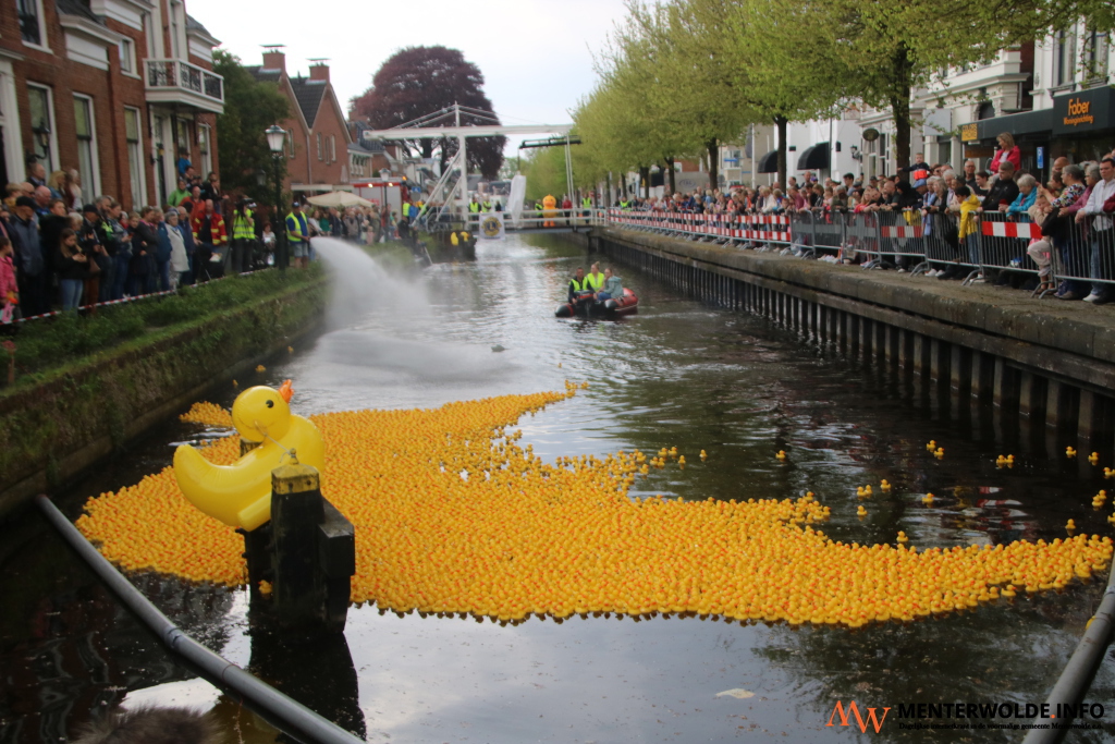3.000 badeendjes - allen voorzien van een nummer van 1 tot en met 3.000 - dobberen vrijdag 15 mei in het Meedenerdiep in Muntendam. Die leggen - met behulp van de brandweerspuit - een traject af. Dit is een van de activiteiten die de jubileumcommissie v.v. Muntendam in het kader van het 100-jarig bestaan houdt. Het feest is van donderdag 14 tot en met zondag 17 mei.