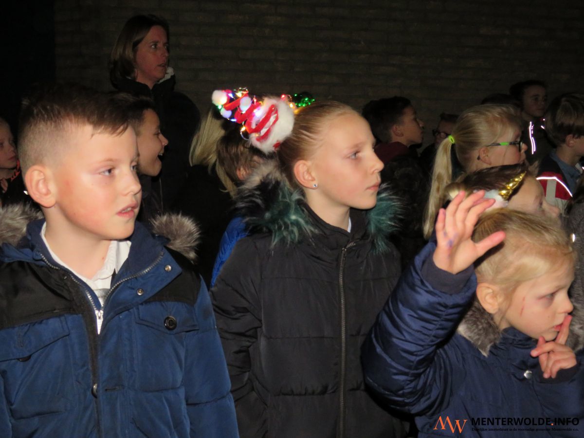 Het jaarlijkse kerstdiner op obs Menterhorn in Muntendam begon vanavond met samenzang op het schoolplein. Onder grote belangstelling van (groot)ouders trapten de jongste leerlingen af met 'O Denneboom'. Het 5 liedjes tellend repertoire werd afgesloten met 'Ik wens je een vrolijk kerstfeest'. Aansluitend zochten de leerlingen hun klaslokaal op om samen het kerstdiner te verorberen.