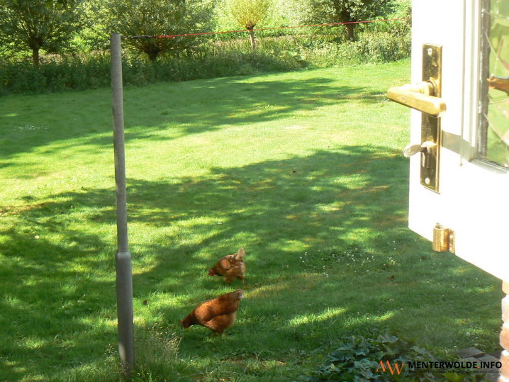 Ook de volgende dag niet. Na een dag mochten ze naar buiten. Eerst nog wat voorzichtig verkennen, maar al snel ontdekten ze hoe groot en fijn het erf was. Het zijn trouwens geen Barnevelders, maar Lohmannen (of Lohvrouwen) en vergeleken met onze stevig Dorkingers lijken het wel anorexiakippen. Hun staart staat fier omhoog en ze zijn voor de duvel niet bang. Ze springen in de voorraadcontainer van het voer als je die opendoet en weten ook dat het openen van de achterdeur kan betekenen dat er lekkere hapjes komen. Ze integreerden ogenschijnlijk goed en legden ook vanaf dag 1 eieren.