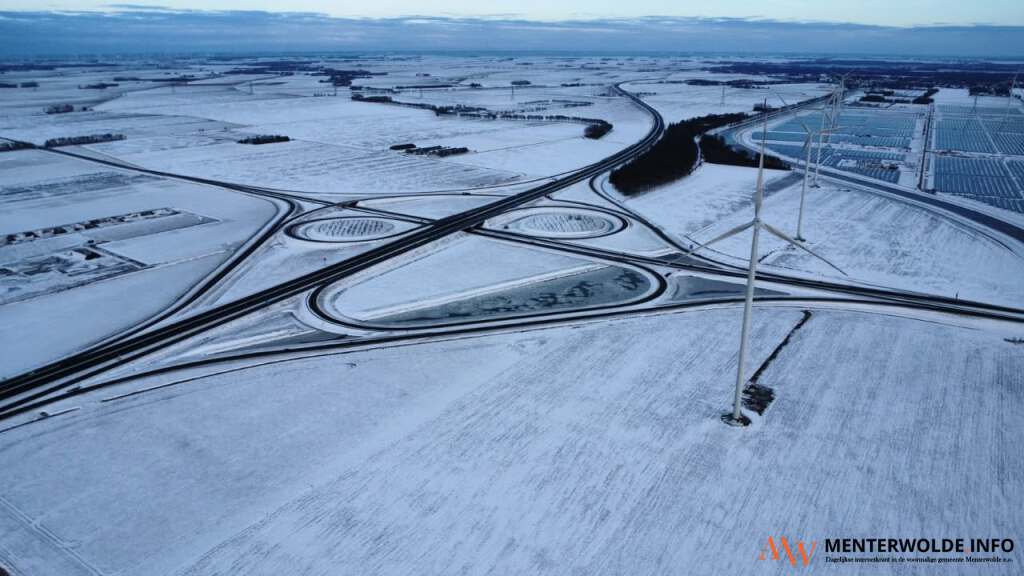 Deze luchtfoto, gemaakt door Martin Hartman, is van het klaverblad N33/A7. De wegen zijn zwart, de omgeving is wit van de sneeuw. Windmolens staan fier overeind en aan de rechterkant is een deel van het zonnepark te zien. Voertuigen zijn niet - of het moet het 'puntje' zijn bij de afslag A7 vanuit de richting Scheemda dat richting Noordbroek gaat - te zien. Luchtfoto's zijn altijd mooi.