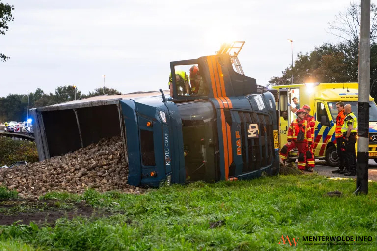 Bietenwagen kantelt op A7 tussen Hoogezand en Foxhol