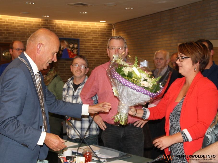 Munniksma had niet alleen een bos bloemen voor Buffinga, hij kreeg ook de zilveren gemeente-ring - 32 millimeter hoog, 23 millimeter breed en 11 millimeter dik - van de burgemeester als dank voor zijn raadswerk. Buffinga maakte sinds maart vorig jaar - na de gemeenteraadsverkiezingen - deel uit van de gemeenteraad van Menterwolde.