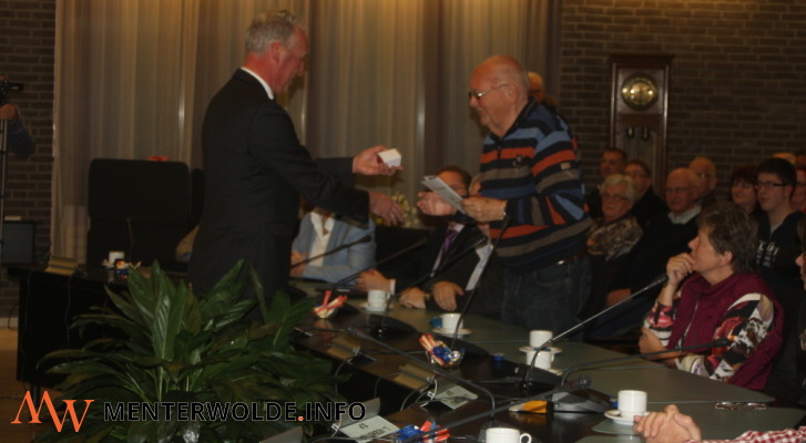 Hij is 32 millimeter hoog, 23 millimeter breed en 11 millimeter dik. Wie? De zilveren ring die de vertrekkende raadsleden van Menterwolde vanavond hebben ontvangen van burgemeester Eduard van Zuijlen. Als dank voor hun raadswerk. Dat varieert van 6 maanden tot 16 jaar. De ring is gemaakt door Margriet Burger-Schouten, van Goudsmid Margriet, uit Noordbroek.