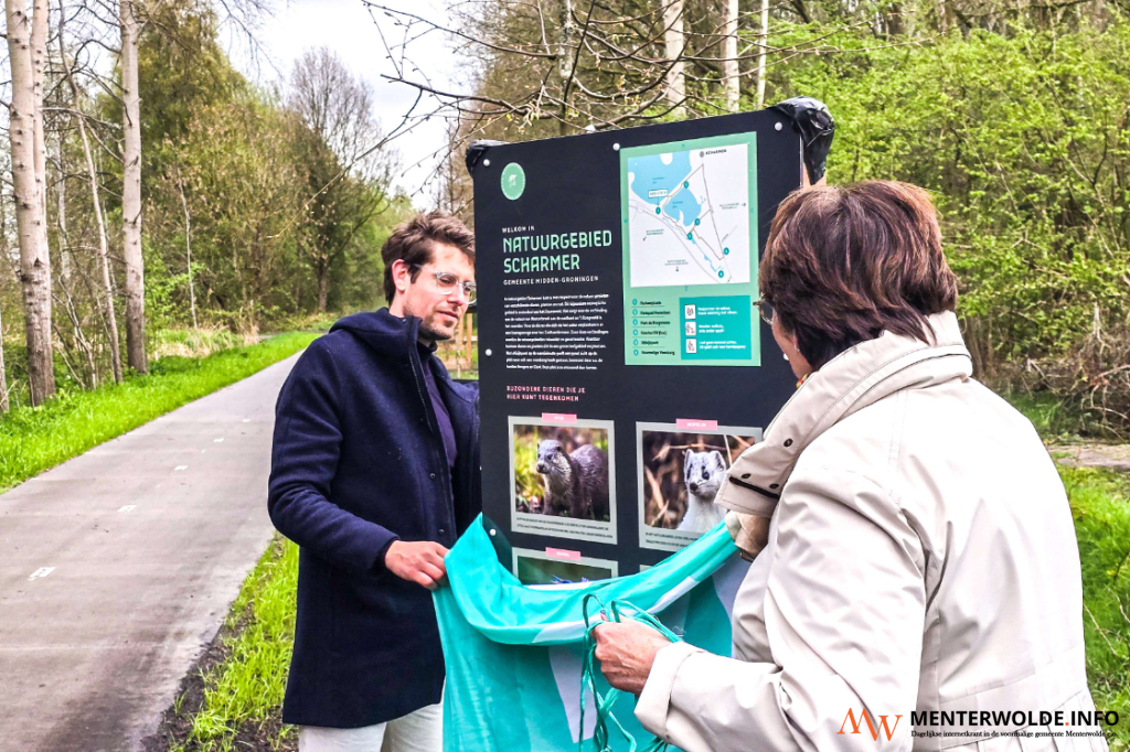 Het fietspad aan de Herenlaan in Scharmer is gistermiddag officieel in gebruik genomen. Jeroen van Dijk (Dorpsvereniging Scharmer) en dorpswethouder Erianne van der Burg van Midden-Groningen onthulden een van de nieuwe informatieborden met foto’s uit en informatie over het gebied. Daarna fietsten de wethouder en Jan Visscher (werkgroep verkeer) als eersten over het fietspad.
