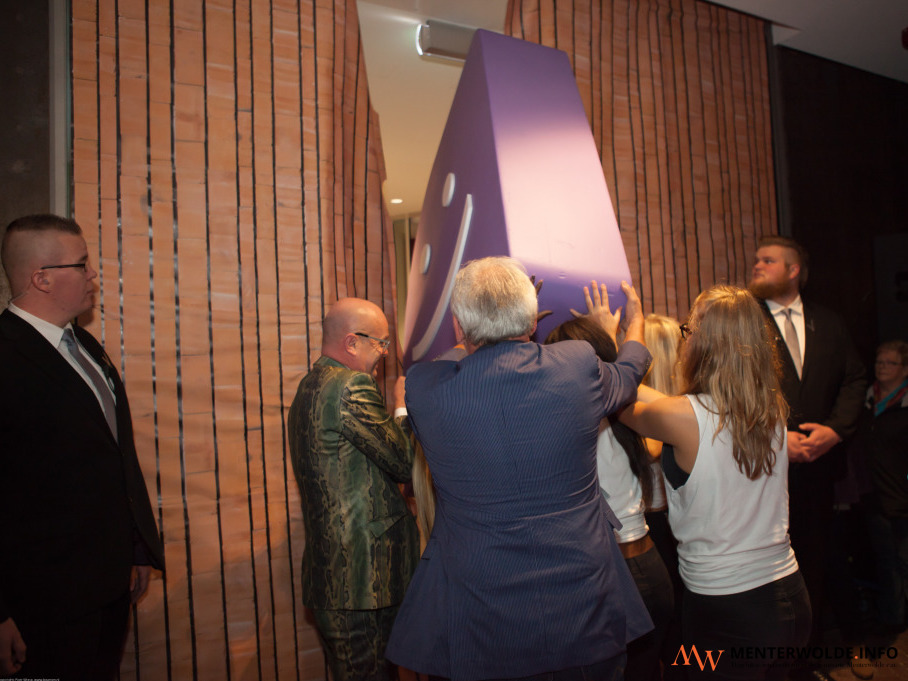 Cabaretier Bert Visscher had de presentatie in handen. Burgemeester Pieter Smit van Oldambt trakteerde de aanwezigen op een virtuele rondleiding door het gebouw.