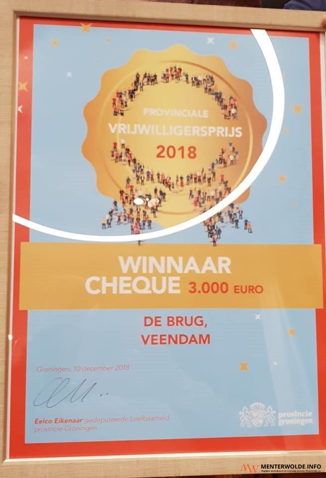 Stichting De Brug Veendam heeft vanavond in het provinciehuis in Groningen de vrijwilligersprijs in de categorie sport gewonnen. Gedeputeerde Eelco Eikenaar had een cheque ter waarde van 3.000 euro voor de Veendammers. De andere genomineerde was de Loopgroep Bedum.Stichting De Brug heeft nog geen idee wat ze met het geldbedrag gaat doen.