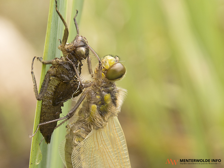 Nieske Siepel zegt over het onder de tekst geplaatste vierluik (technisch gezien helaas niet mogelijk om deze plaat als hoofdfoto te plaatsen/red.): "Dit is een collage van zo'n 'geboorte', uitsluipen. De larve kruipt uit het water en klimt op een rietstengel of het blad van de gele lis. In alle rust wordt daar een libel 'geboren'. Het proces duurt, van geboorte tot en met drogen en kleuren, ongeveer 3 uur. Pas dan kan de libel vliegen."