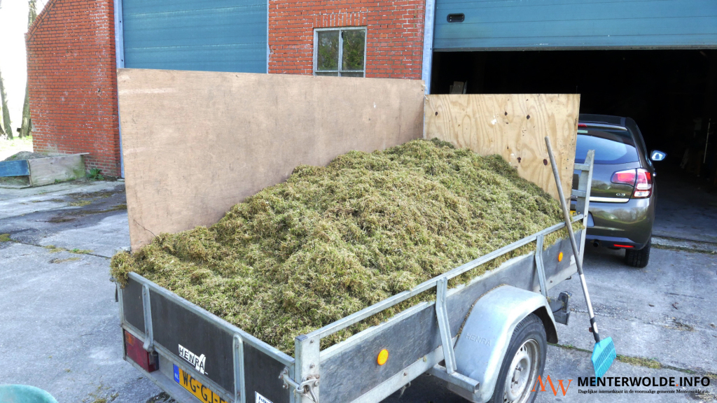 Het grote afvoeren kon beginnen. We liepen af en aan met volle kruiwagens om ze achter het huis in de aanhanger te legen. Omdat het hard ging waaien en er meer mos buiten de kruiwagen viel dan erin, moesten we aan het eind van de middag noodgedwongen stoppen. Het was ook wel even mooi geweest en bovendien was de aanhanger vol.