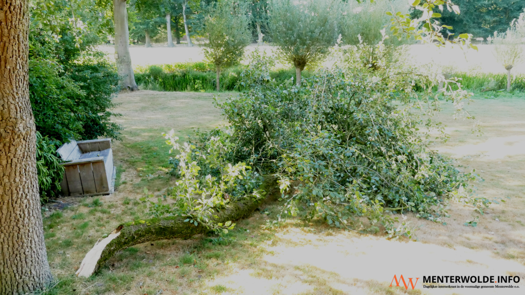 Op een morgen was de ramp geschied. Een hele zware, dikke tak (bijna de helft van de boom) was bezweken en afgeknapt. Wat een tragisch gezicht. Een oude dame die minstens de helft van haar lijf en haar kroost verloren heeft.