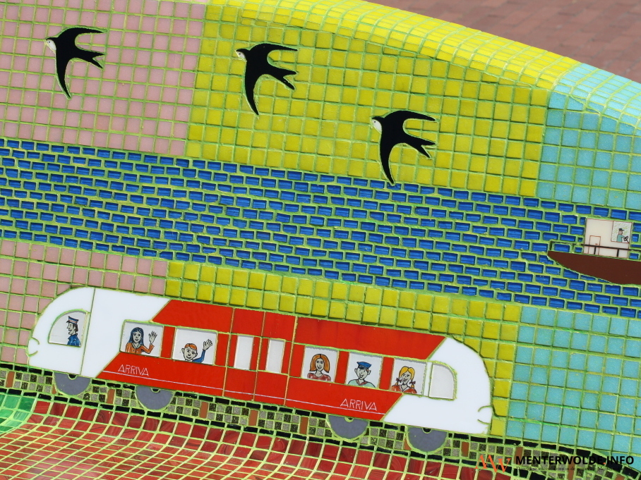 Ik heb al een flat gebouwd, een straat aangelegd, een vijver gegraven, bloemenweides gezaaid en bootjes laten varen. Ik heb al veel banken zien ontstaan en groeien. Het meest bijzondere moment is wanneer de bank gevoegd wordt. Eerst worden alle lijmresten er uitgepeuterd, de scherpe randjes worden bijgeslepen en onvolkomenheden hersteld. En dan kan het voegen beginnen. Hoe kleurrijk de bank ook is, de voeg heeft maar 1 kleur. Voor je ogen ondergaat hij dan een metamorfose. Alles wordt met elkaar verbonden, het wordt een eenheid en alle onderdelen gaan op in het geheel. Daarna wordt hij geïmpregneerd en op zijn plek gezet. Dat is nog een hele klus. Zo’n bank weegt 1.700 kilo, moet dus goed in de takels hangen en heeft een stevige ondergrond nodig. Het is altijd een wat weemoedig moment. We zijn trots dat we het samen in 600 mensuren maar weer gefikst hebben en droevig dat we afscheid moeten nemen.
