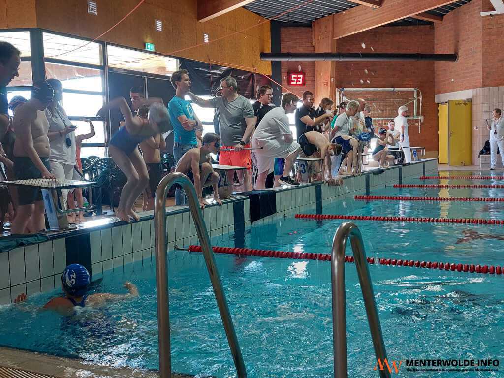 Elke zwemmer legt steeds 50 meter (vrije slag) af. De estafette begint om 9.00 uur.