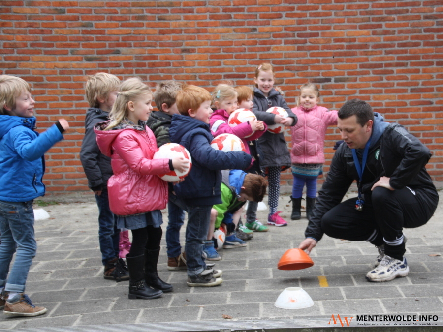 Met een net vol ballen, een doeltje, hesjes en pionnen ging jeugdvoetbaltrainer Pieter Jager van v.v. Meeden vanmorgen op bezoek bij de groepen 1 en 2 van obs De Mieden en cbs Sjaloom in Meeden. Met als doel deze leerlingen warm te maken voor het voetbal. Beide scholen reageerden positief op het verzoek van Jager om eens een gasttraining te geven op het schoolplein.
