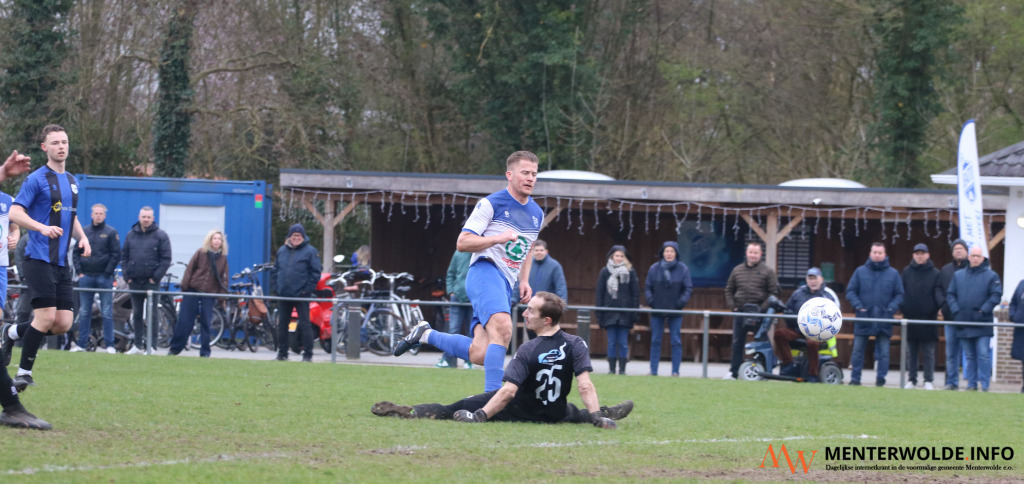 Voor rust niet eentje, na rust kregen de gasten in de 69e minuut de eerste grote kans. Scheidsrechter Dijks uit Zwartemeer - hij floot zijn eerste wedstrijd op dit niveau - gaf Meeden een strafschop, nadat Tom Aalst Mark Slim onderuithaalde in het strafschopgebied.
