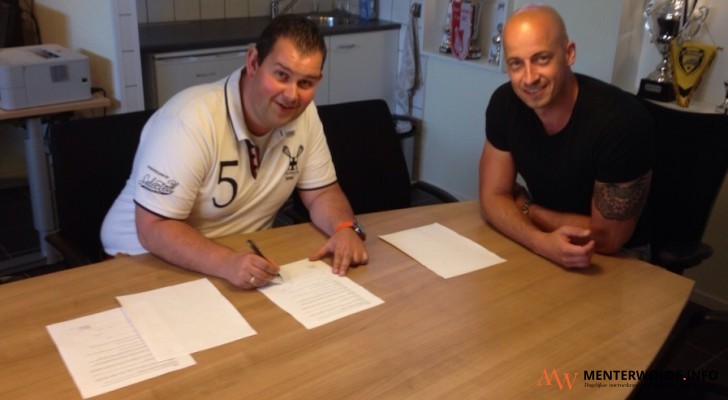 Foto: Jos de Vrieze ondertekent zijn contract in de bestuurskamer van Meeden onder het tgoeziend oog van voorzitter Jeffrey Toorn. Foto: Bert Kaman.