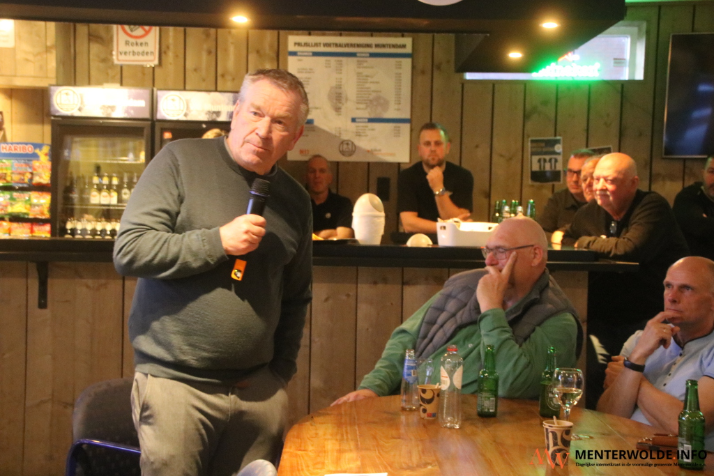 Met een lezing van oud-directeur FC Groningen Hans Nijland heeft v.v. Muntendam gisteravond haar activiteiten in het kader van het 100-jarig bestaan afgetrapt. De kantine was met zo'n 60 toehoorders goed gevuld. En smulden van de ene na de andere anekdote van Nijland. Een aantal van deze verhalen staat ook in het in 2021 uitgebrachte boek 'Hans Nijland, boerenbluf op de transfermarkt'.
