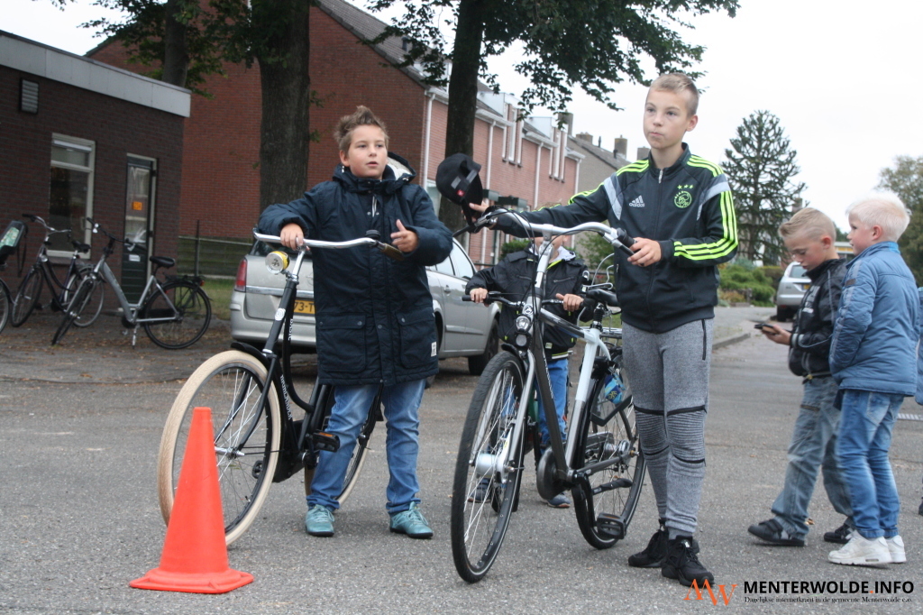 Werkt het voor- en achterlicht? Is de achterreflector in orde? Zijn de trapreflectoren in orde? Is er zijreflectie op de wielen? Zijn de banden opgepompt? Zit het zadel recht, op de juiste hoogte en vast? Zit het stuur recht en vast? Heeft de fiets een goed werkende bel? Aan de fiets van Thijs Lugtenborg (6, foto boven), speler van J.O. 7 van Muntendam, mankeert helemaal niets.