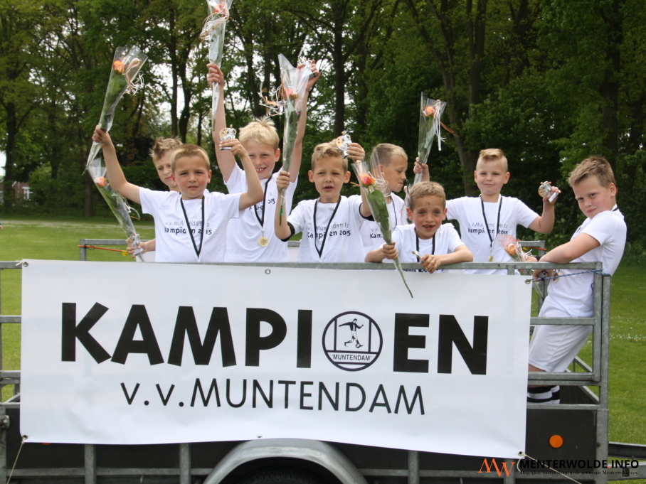 Rowan Westerbrink (doelman), Joris Kaiser, Ties Struijk, Pascal Meertens, Sem van der Laan, Mayk Bijlholt, Anton Martens en Sander Lageveen beleefden vanmorgen, als spelers van Muntendam F2, het hoogtepunt van hun nog prille voetbalcarrière. De ploeg van het duo Richard Bijl en Harry Martens won de kampioenswedstrijd tegen Veendam 1894 F5 met 3-2. Mayk, Joris en Anton maakten de goals.