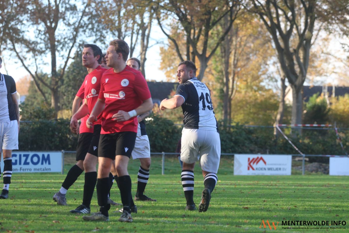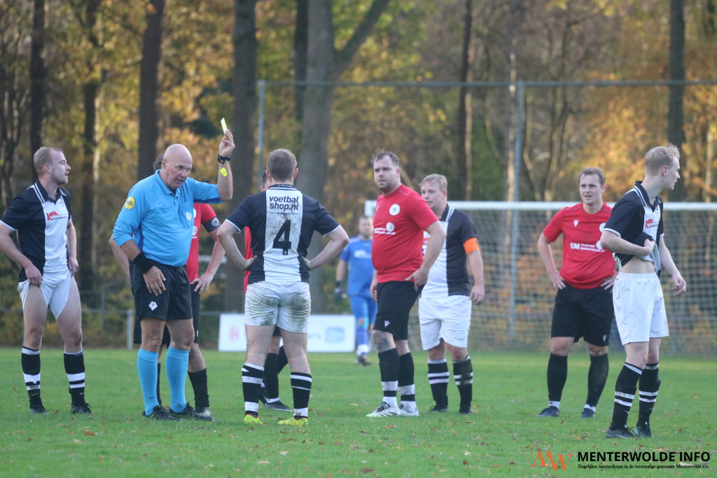Scheidsrechter Hansen deelde gele kaarten uit aan Desley Lamain, Kevin Bijl en Bryan Weerman van Muntendam en Sander Spijker van Bareveld.