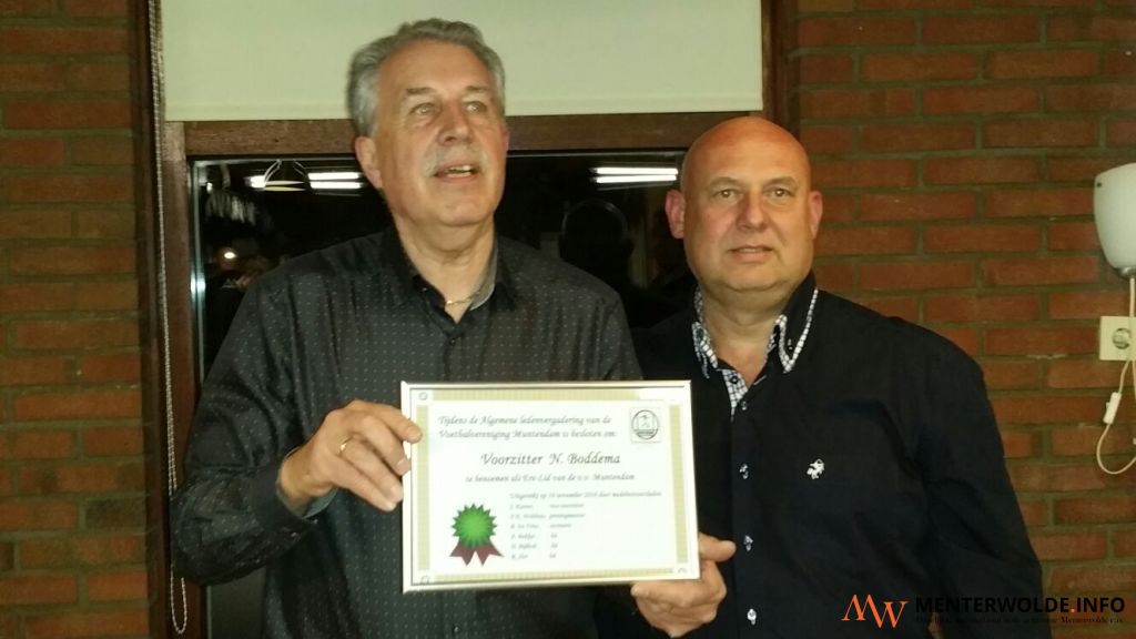 Ko Boddema (68) is vanavond, tijdens de algemene ledenvergadering van v.v. Muntendam (met 40 leden), benoemd tot erelid. Boddema was de afgelopen 10 jaar clubvoorzitter. Daarvoor was hij al eens 6 jaar bestuurslid. Vicevoorzitter Jenne Koenes (52), in januari is hij 3 jaar bestuurslid, neemt de voorzittershamer voorlopig over van Boddema. Het bestuur zoekt een nieuwe 'vaste' voorzitter.