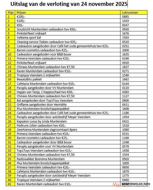 Lotnummer 0885 van de grote verloting ten bate van de jeugdafdeling van v.v. Muntendam is 200 euro waard. Dit nummer werd gisteravond in de kantine van de voetbalvereniging getrokken als eerste prijs. Lotnummer 1433 is goed voor 100 euro aan contanten en lotnummer 0547 is nog altijd 50 euro waard. De prijzen kunnen tot 24 december worden opgehaald bij Henriëtte de Groot.